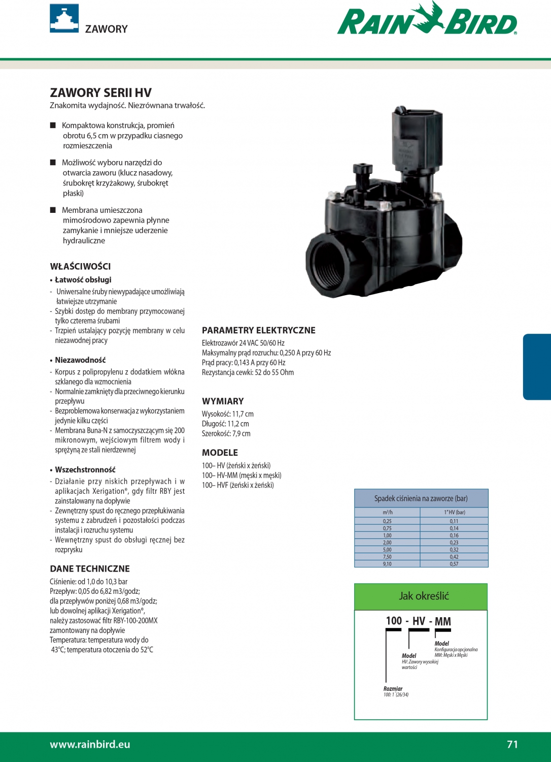 Elektrozawór Rain Bird 100-HVF to elektryczne rozwiązanie przeznaczone do automatycznego otwierania lub zamykania przepływu wody. Znajduje zastosowanie w systemach nawadniania ogrodów oraz szklarni. W odróżnieniu od modelu Rain Bird 100-DV, wykonany jest z lżejszego i cieńszego tworzywa, a jego pokrywa mocowana jest za pomocą mniejszej liczby śrub. Wyposażony w cewkę elektromagnetyczną 24 VAC, daje również możliwość ręcznego uruchomienia przepływu. Ten model posiada dodatkowo dźwignię kontroli przepływu.